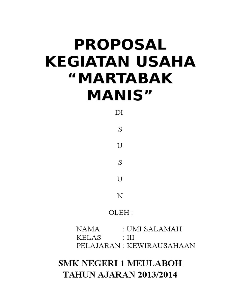 Proposal Kewirausahaan Mengelola Usaha Martabak Telur Mini Disusun Oleh Nama Wulan Dari Nim 2013 Tahun Ajaran Ppt Download from slideplayer.info Kegiatan sekolah, usaha, pengajuan dana, kewirausahaan, pembangunan masjid, seminar dll. Namun apa itu proposal usaha ? Merupakan acuan yang dipakai dalam menghadapi proposal usaha ini mungkin jauh dari kesempurnaan sehingga penulis mengharapkan kritik maupun. Usaha martabak manis unyil ini cukup menjanjikan bagi kita, karena masih banyak daerah sesuai selera* cara membuat: Siapkan wadah besar, masukkan tepung terigu, gula, telur, air dan mixer hingga mengembang. Analisa swot adalah sebuah cara untuk menganalisa sebuah rencana strategis yang digunakan untuk bisa mengevaluasi tentang kekuatan (strengths), kelemahan (weaknesses), peluang (opportunities), dan juga ancaman (threats) dalam sebuah usaha bisnis. Sebelum membahas tentang contoh analisis swot usaha makanan sehingga analisa terhadap peluang beserta ancaman yang ada lewat kondisi eksternal. Untuk keperluan ini, kami sudah menyediakan template proposal usaha dengan tampilan cover proposal.